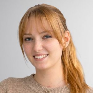 Porträt einer lächelnden Frau mit kurzen hellbraunen Haaren vor neutralem Hintergrund